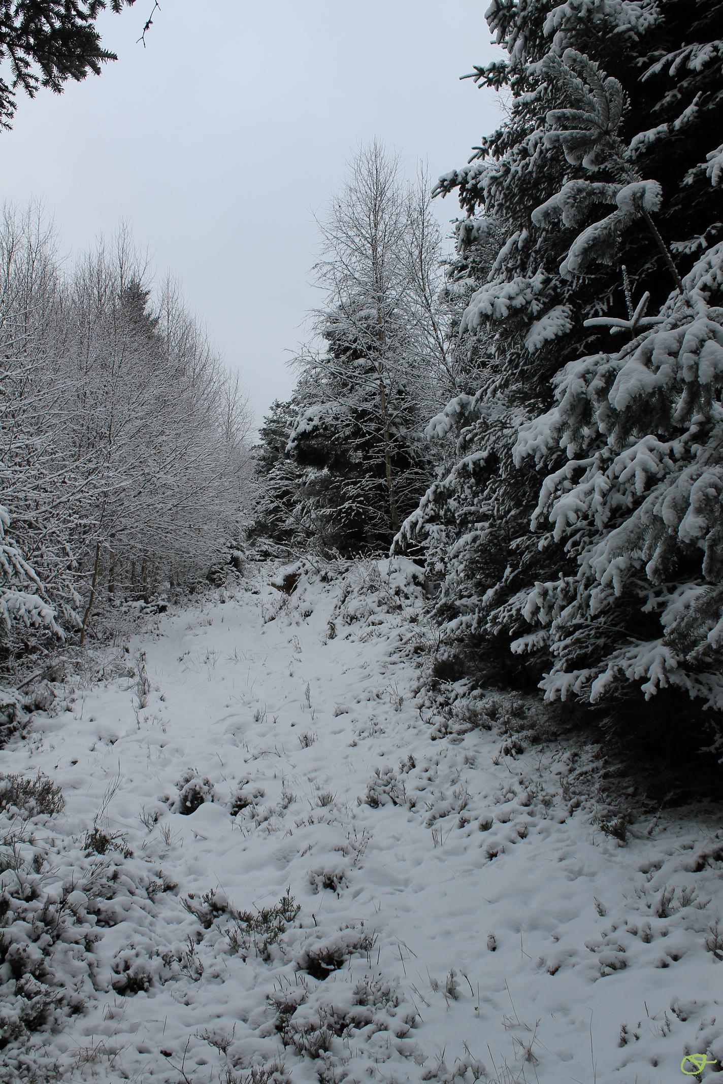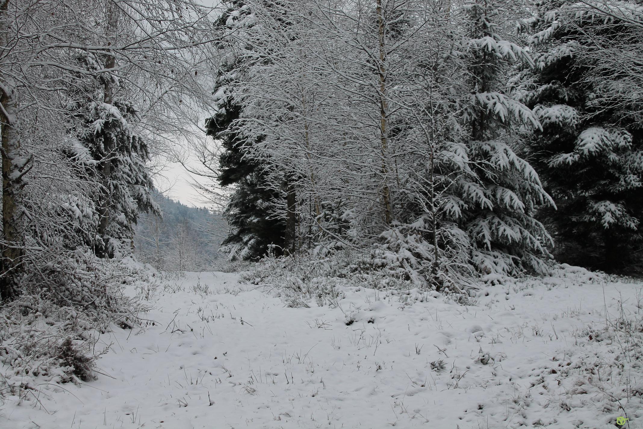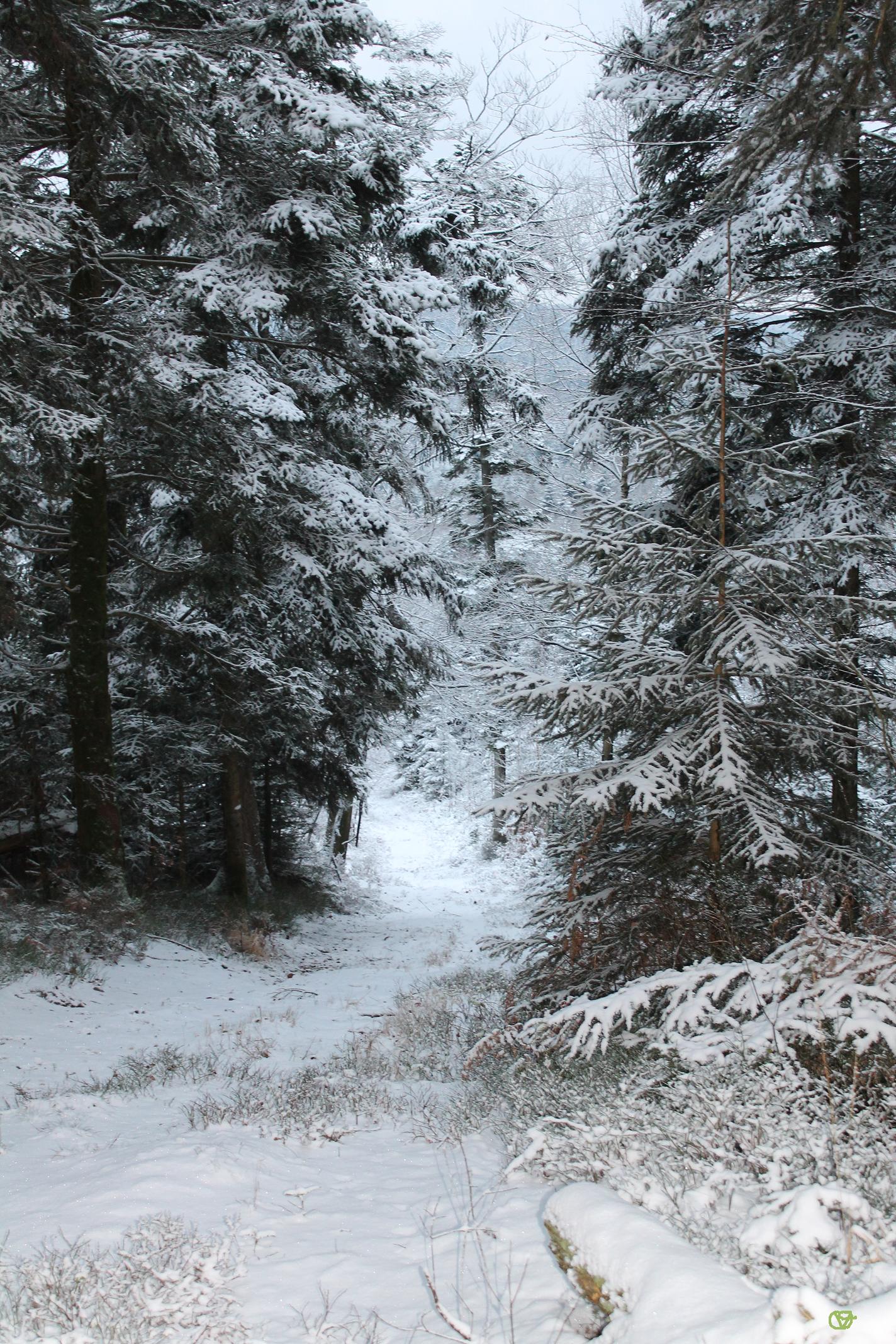 Quelques sapins, façon gaufres saupoudrées de sucre glace.Maison forestière du Coichot.Roches de Quérel.