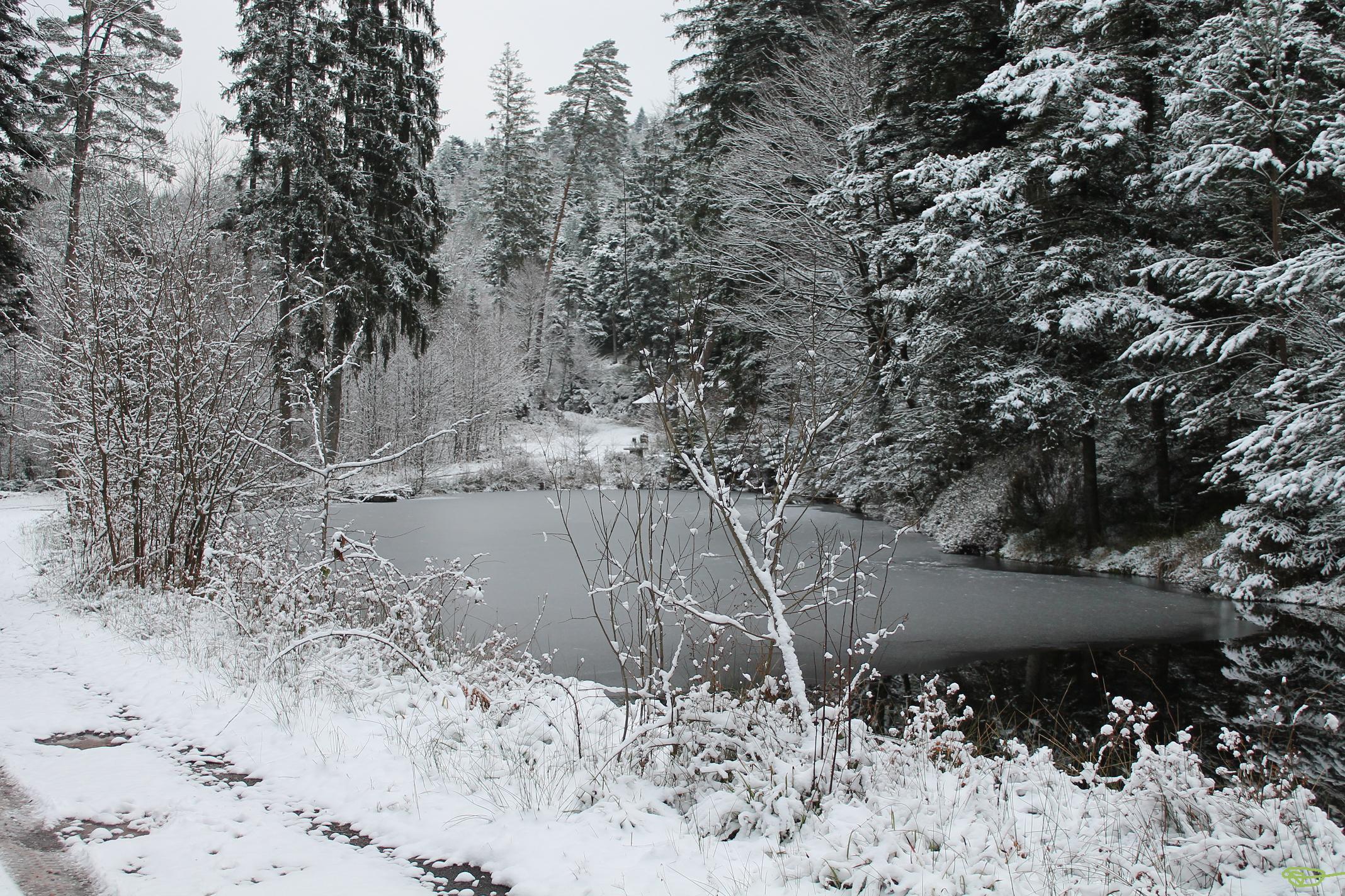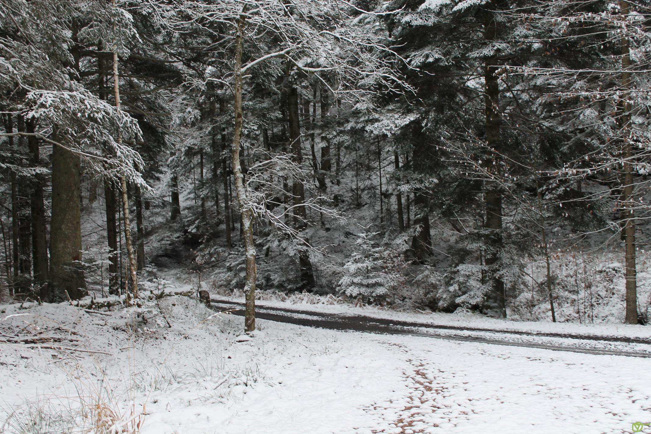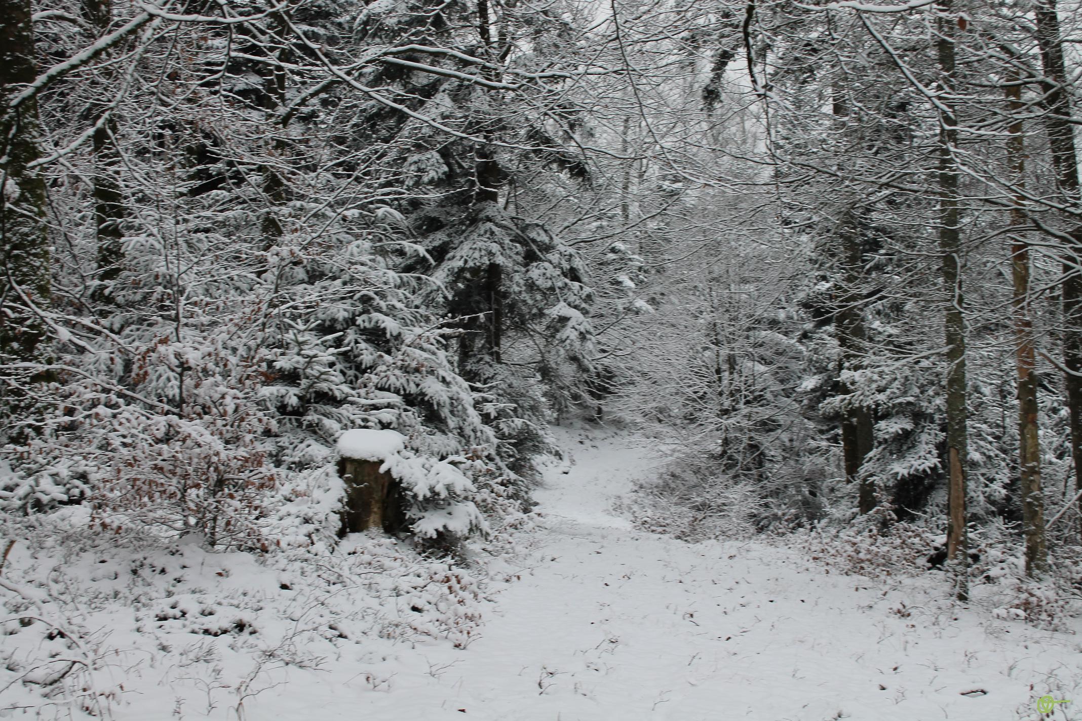 Quelques sapins, façon gaufres saupoudrées de sucre glace.Maison forestière du Coichot.Roches de Quérel.
