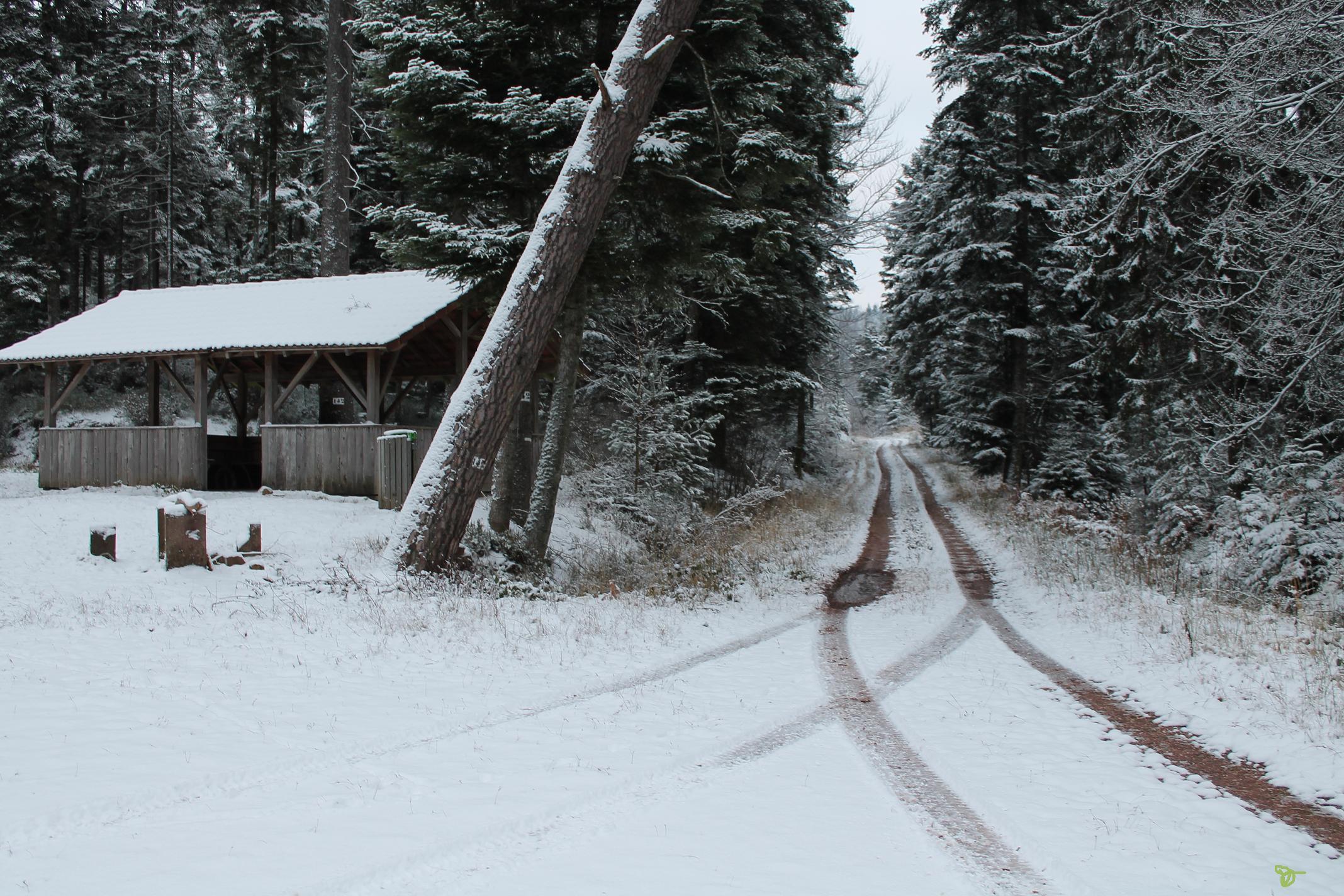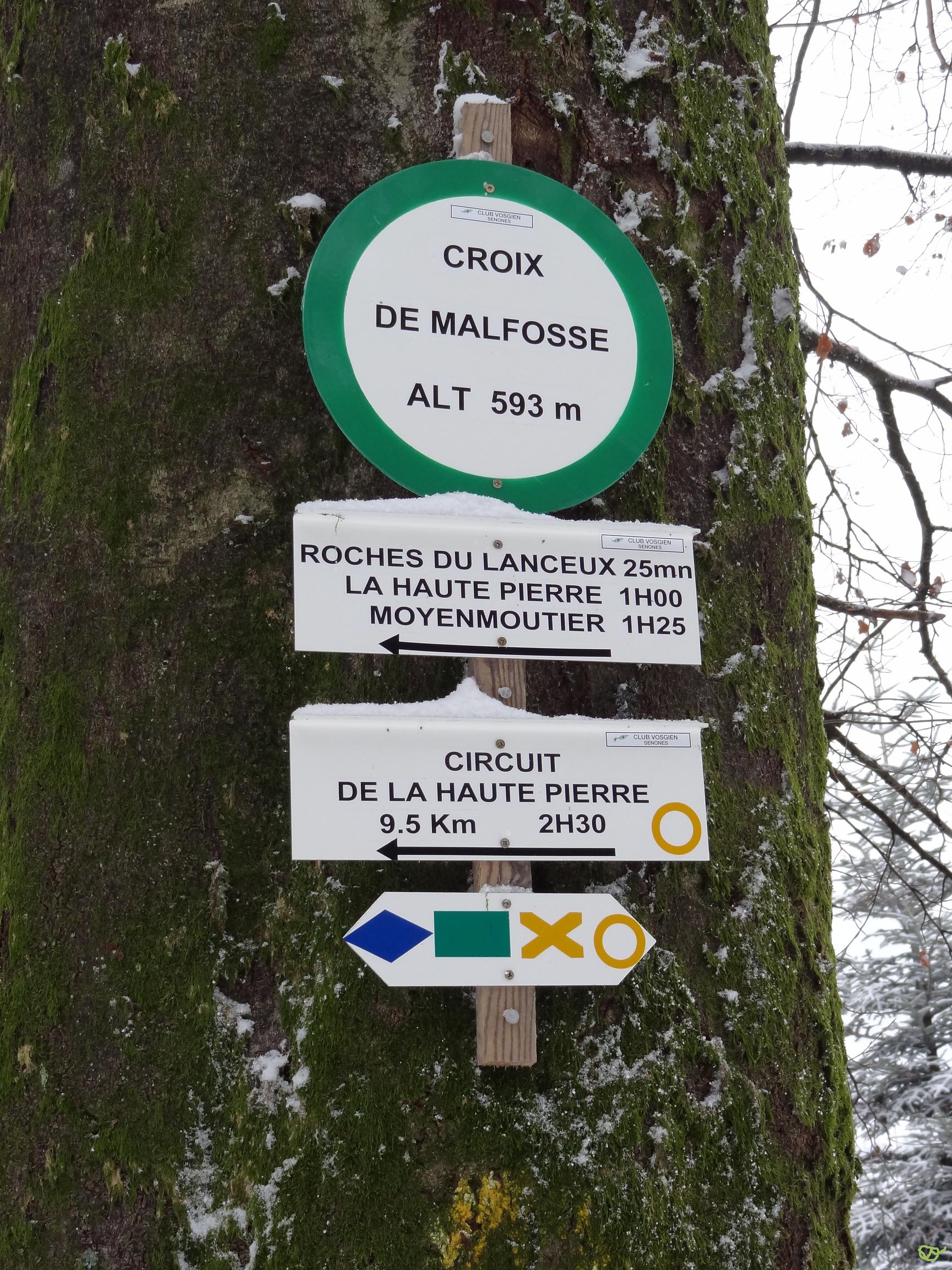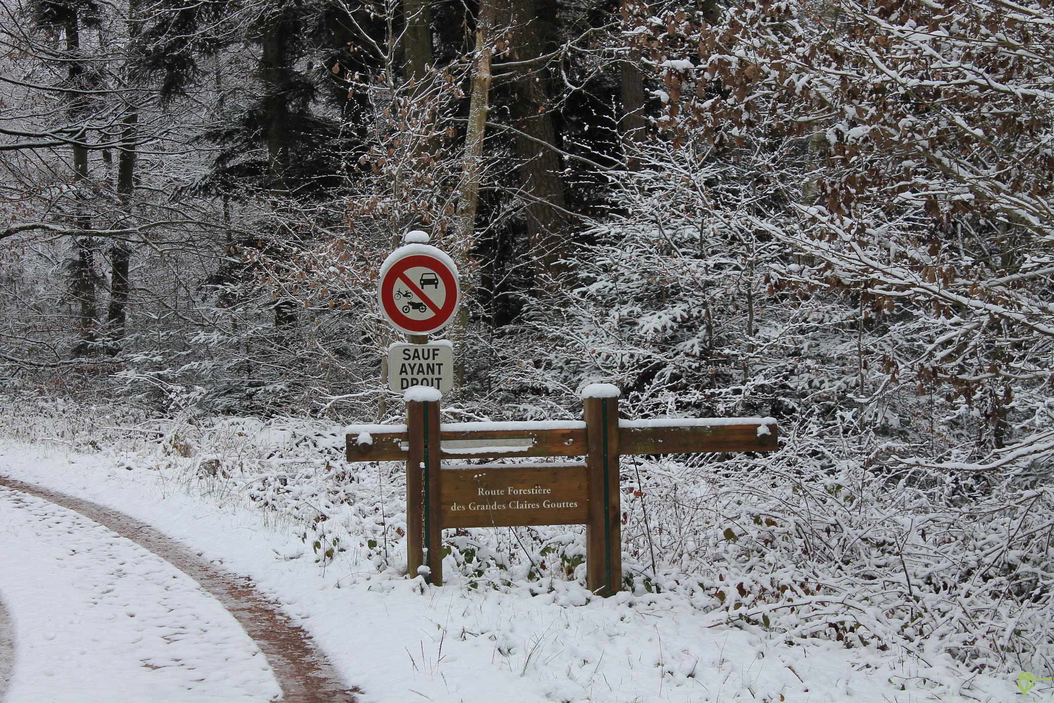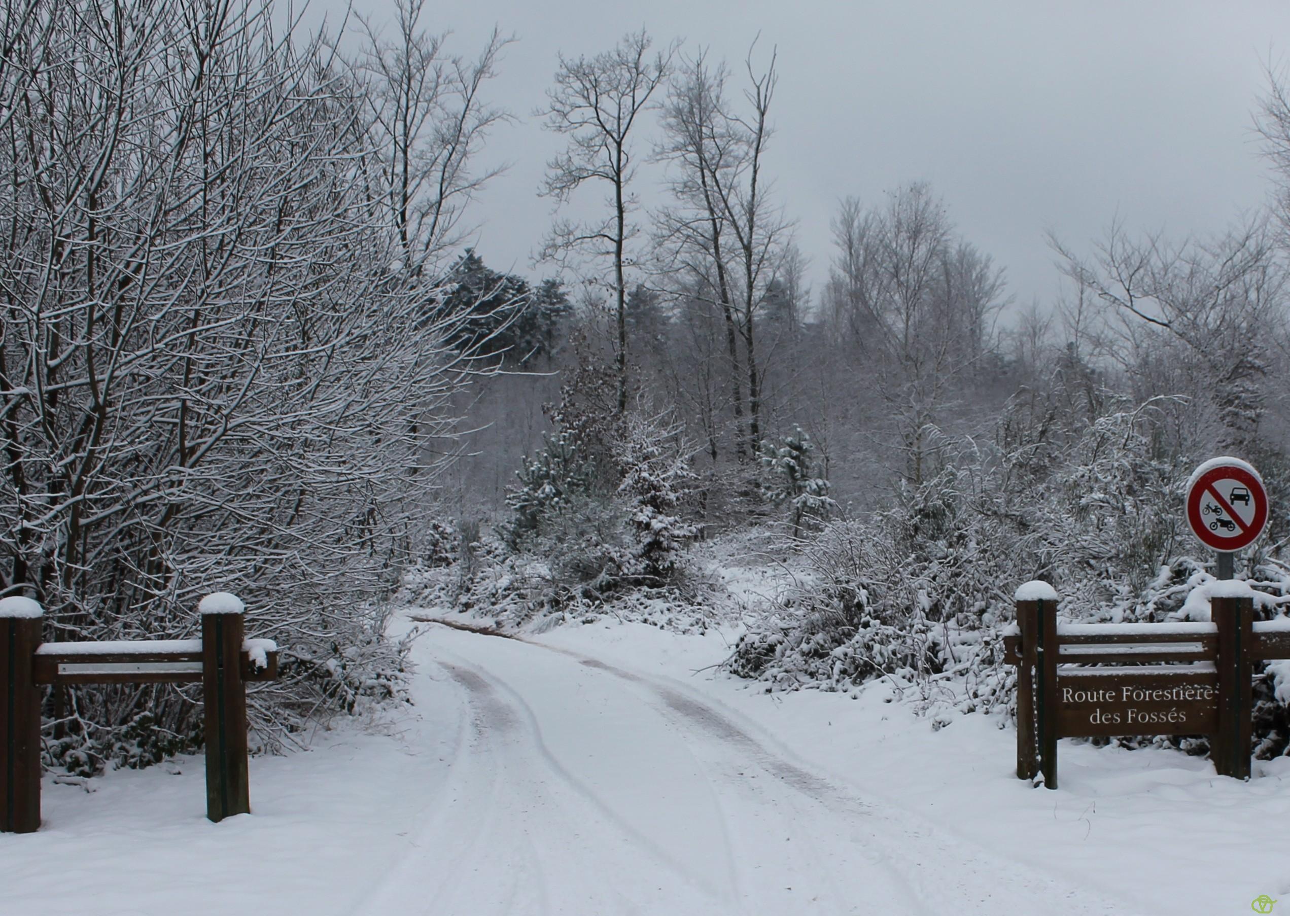 Descriptif: se garer sur le parking, avant le cimetière militaire, au départ de la Route Forestière des Fossés. Prendre sur votre droite La Route Forestière des Chasseurs, circuit •. Avant d’arriver à la maison forestière de St Benoît, prendre à gauche sur la route Forestière des Grandes Claires Gouttes. Au niveau de la ligne à haute tension traverser le ruisseau à droite et reprendre encore à droite jusqu’aux premières maisons, et remonter sur la gauche. Là, la suite est très périlleuse suivre le balisage rond bleu très très rare, et cette journée les sentiers sont enneigés, ils deviennent vite non repérables. Alors s’armer de patience et de vigilance, bien se repérer sur la carte et surtout se méfier des chemins forestiers non présents sur la carte.