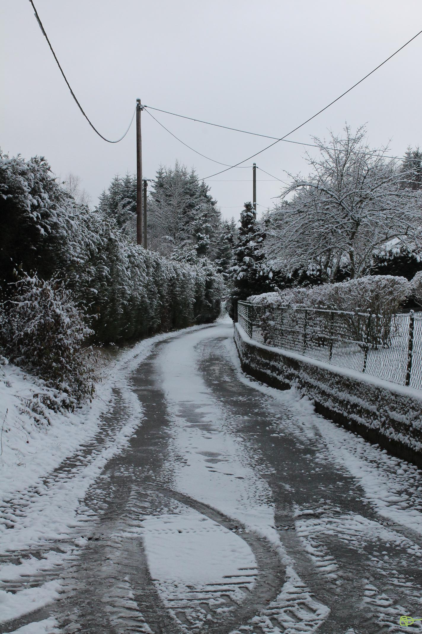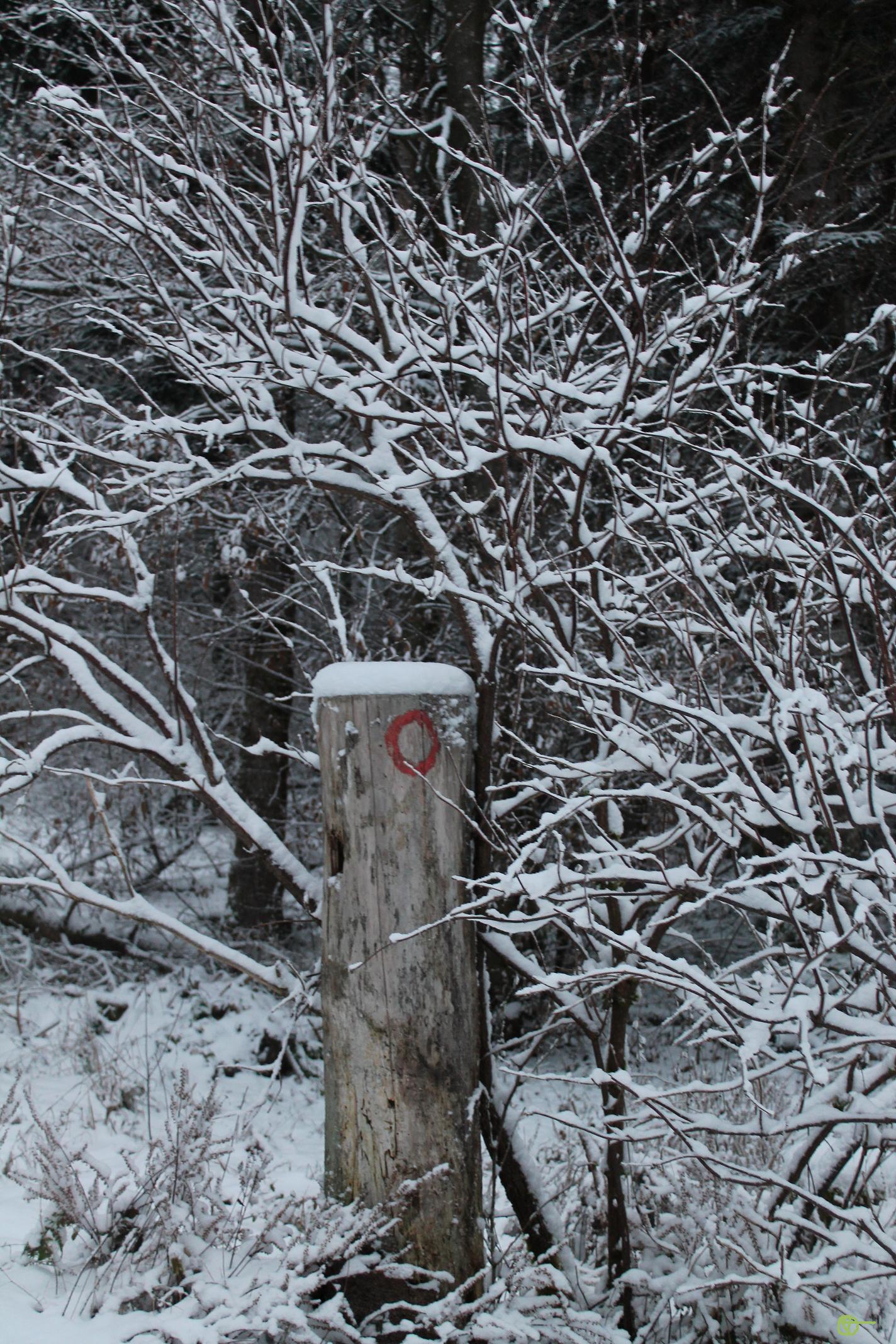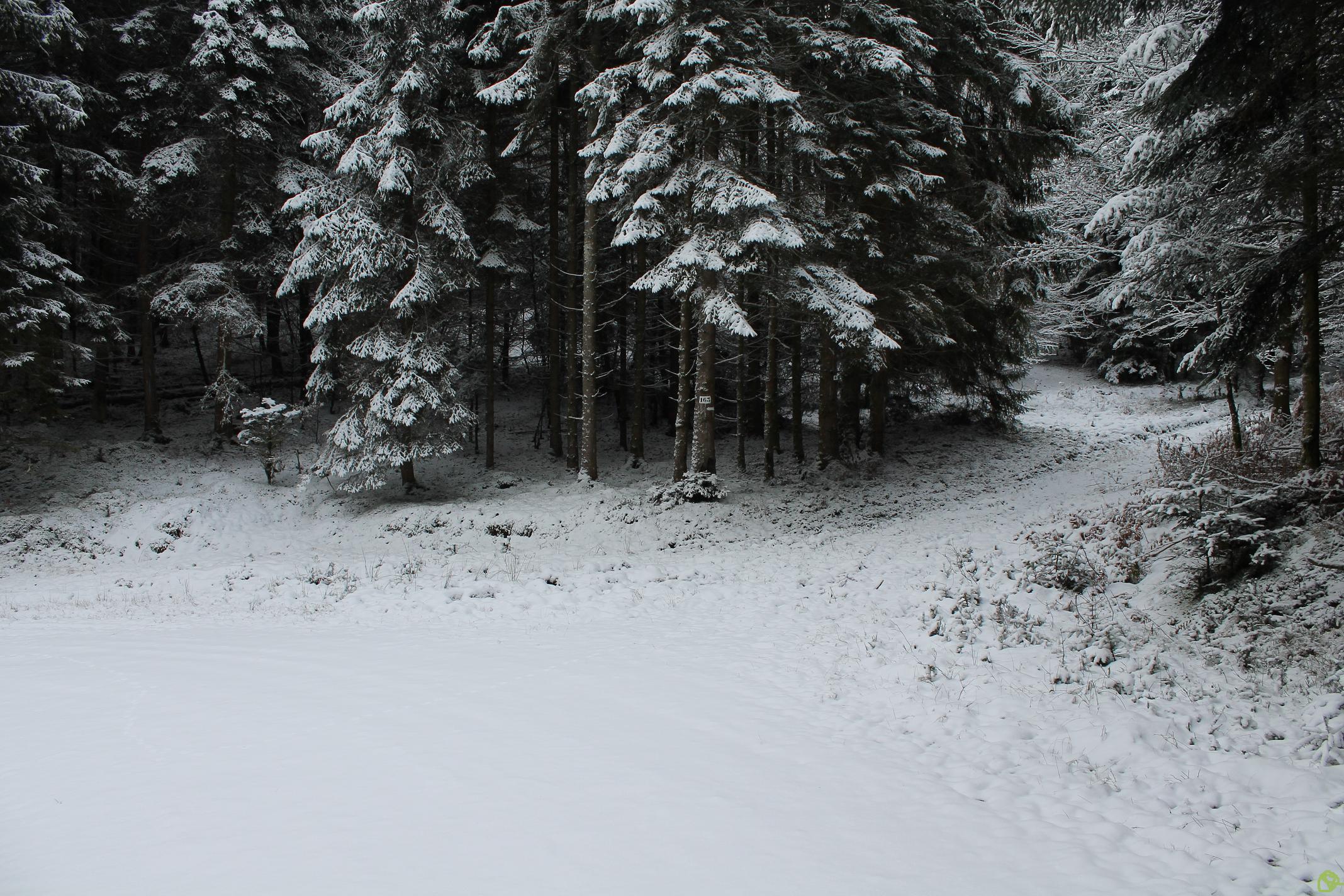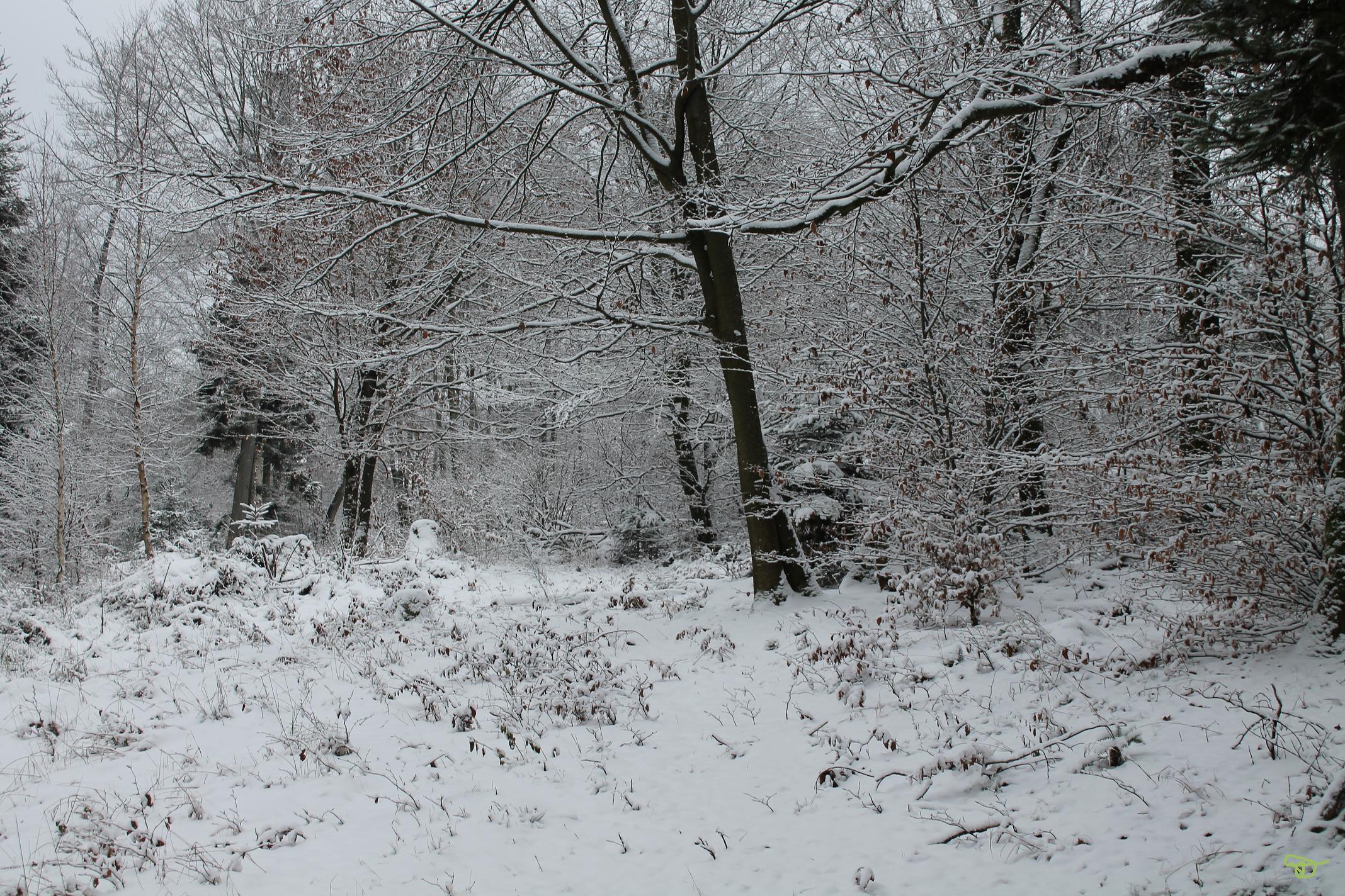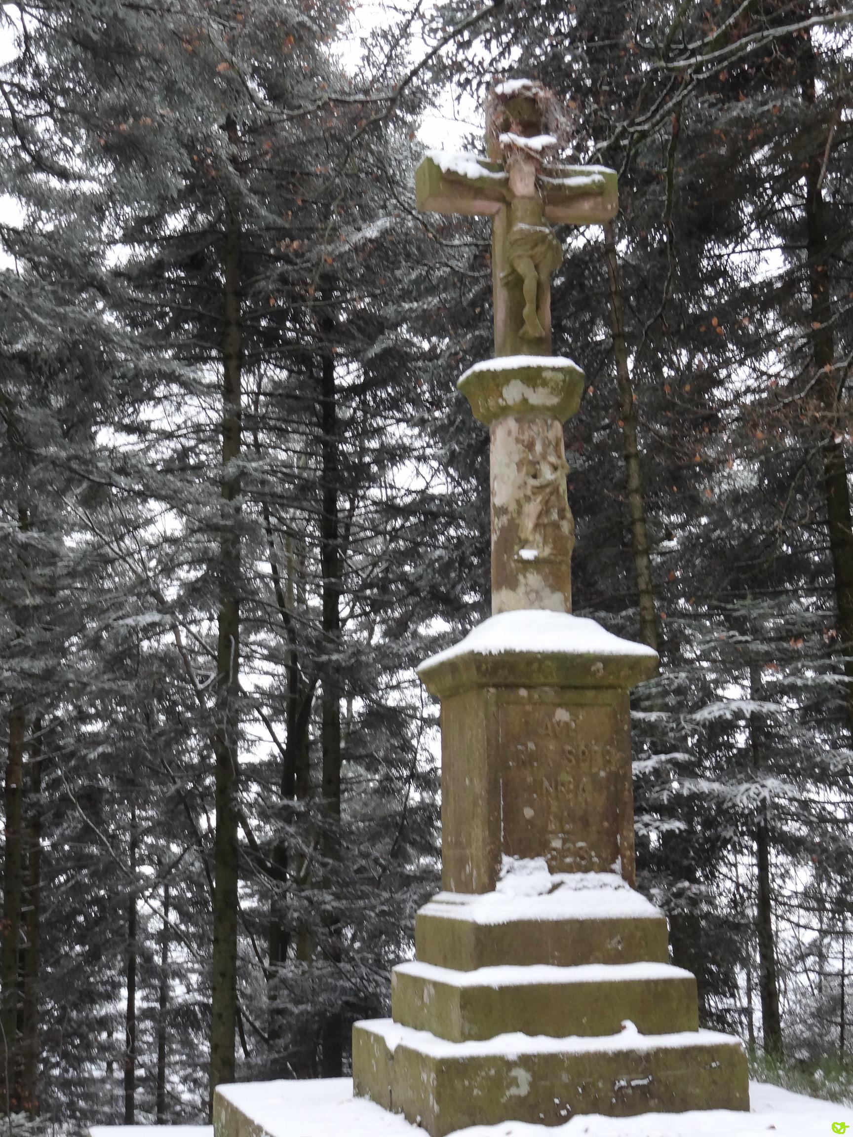 Descriptif: se garer sur le parking, avant le cimetière militaire, au départ de la Route Forestière des Fossés. Prendre sur votre droite La Route Forestière des Chasseurs, circuit •. Avant d’arriver à la maison forestière de St Benoît, prendre à gauche sur la route Forestière des Grandes Claires Gouttes. Au niveau de la ligne à haute tension traverser le ruisseau à droite et reprendre encore à droite jusqu’aux premières maisons, et remonter sur la gauche. Là, la suite est très périlleuse suivre le balisage rond bleu très très rare, et cette journée les sentiers sont enneigés, ils deviennent vite non repérables. Alors s’armer de patience et de vigilance, bien se repérer sur la carte et surtout se méfier des chemins forestiers non présents sur la carte.